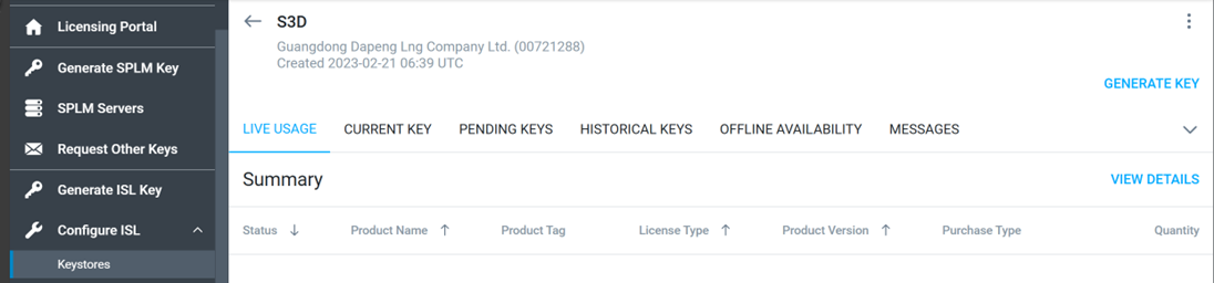 • LIVE USAGE 用于显示当前密匙库中授权的使用状态;